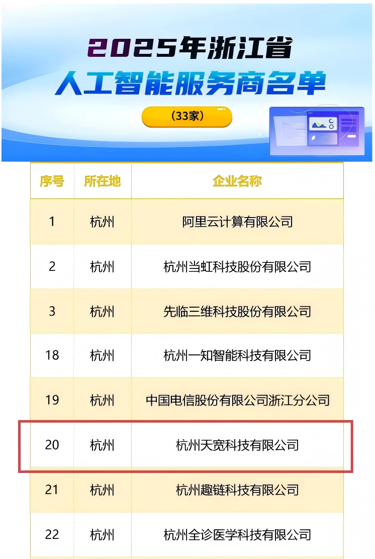 10月11日,浙江省經(jīng)信廳正式公布了《2025年浙江省人工智能應(yīng)用場景、應(yīng)用標(biāo)桿企業(yè)、人工智能服務(wù)商及“數(shù)智優(yōu)品”》遴選結(jié)果。經(jīng)過嚴(yán)格評審程序,天寬科技憑借在人工智能技術(shù)研發(fā)、場景落地與綜合服務(wù)能力方面的突出優(yōu)勢,成功獲評“浙江省人工智能服務(wù)商”。