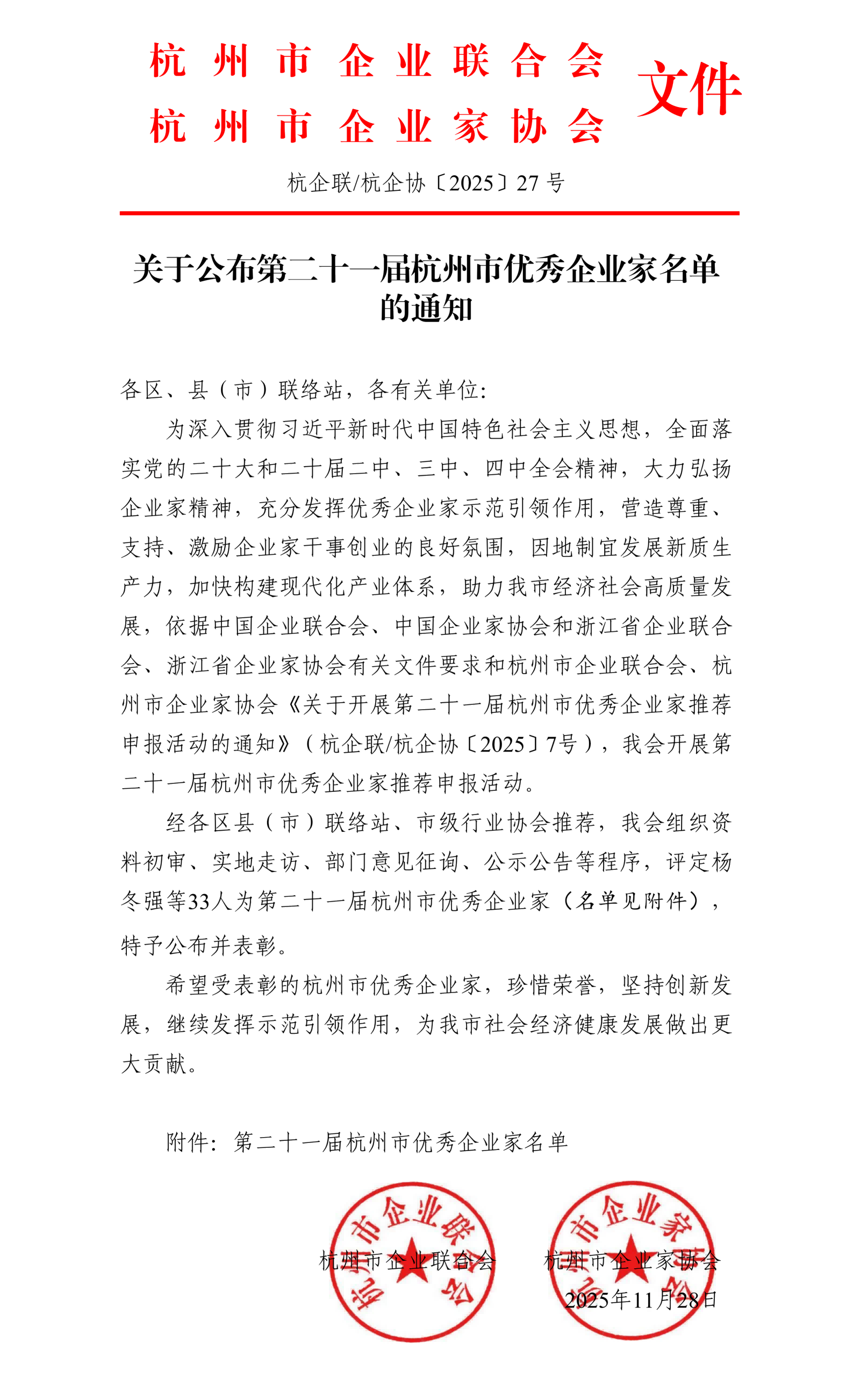 本次評(píng)選由杭州市企業(yè)聯(lián)合會(huì)、杭州市企業(yè)家協(xié)會(huì)組織開展,通過資料初審、實(shí)地走訪、部門意見征詢等程序進(jìn)行綜合考量和推選,旨在大力弘揚(yáng)企業(yè)家精神,充分發(fā)揮優(yōu)秀企業(yè)家示范引領(lǐng)作用,營造尊重、支持、激勵(lì)企業(yè)家干事創(chuàng)業(yè)的良好氛圍,因地制宜發(fā)展新質(zhì)生產(chǎn)力,加快構(gòu)建現(xiàn)代化產(chǎn)業(yè)體系,助力經(jīng)濟(jì)社會(huì)高質(zhì)量發(fā)展。